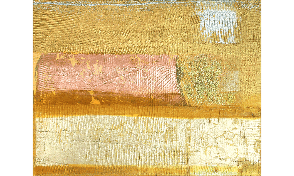 rosa | 40 x 40 cm | Tuval üzerine yağlıboya, ambalaj bantları, kum, altın kaplanmış |